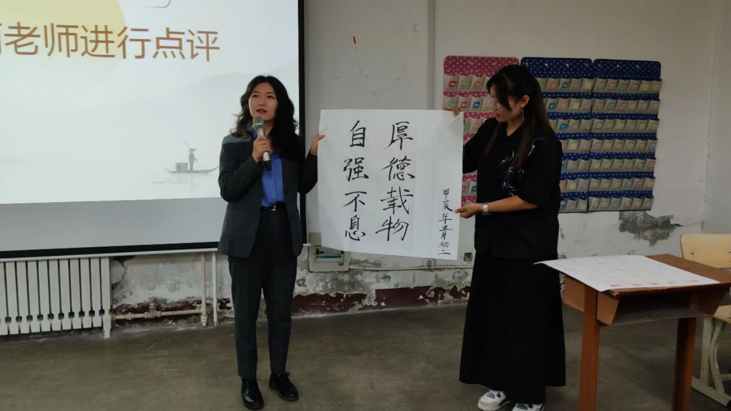 在揭晓成绩前,播放了“笔墨传情,文化筑梦”三笔字活动举办期间同学们比赛情况以及评委投票的视频。同时邀请优秀学生代表现场展示书法作品,中文系书法博士刘亚丽老师对学生代表展示的毛笔、粉笔、硬笔作品依次进行点评。点评结束后,刘亚丽老师进行了以“强国有我”为内容的现场书法展示。