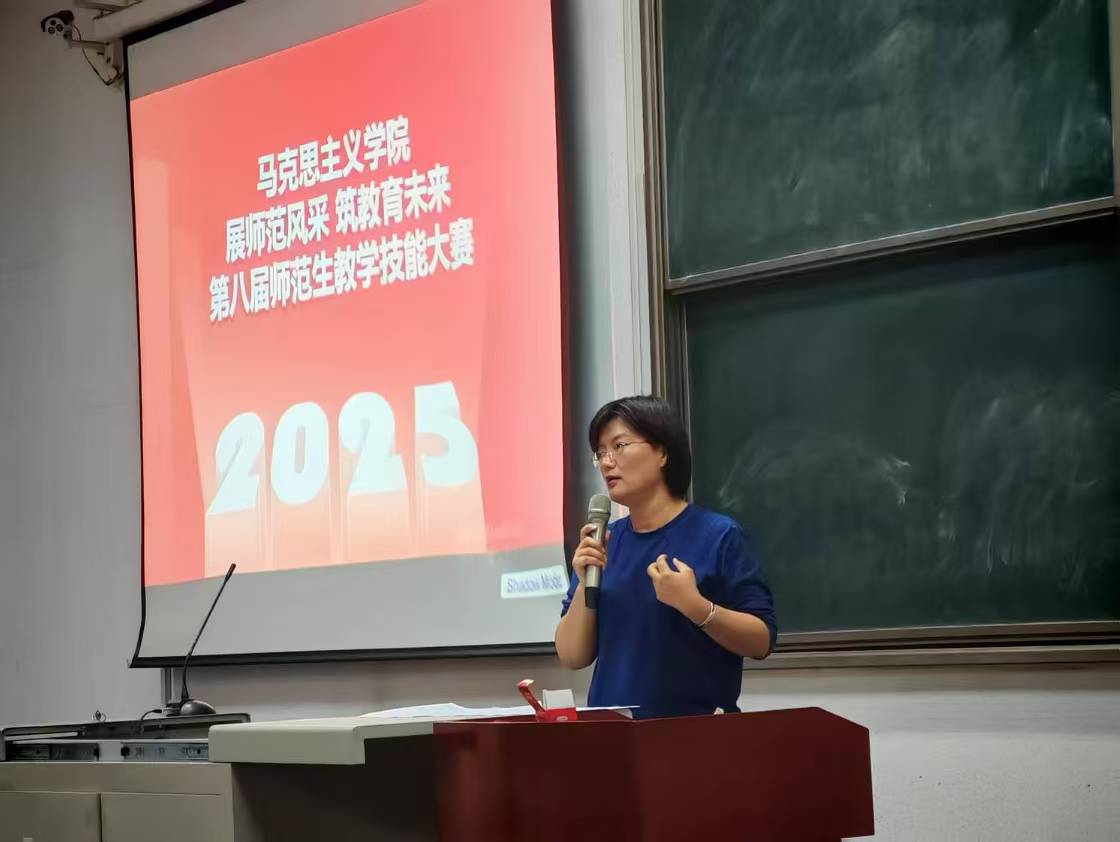 太阳集团tyc539副院长贺晓娟在点评中首先肯定选手们的精彩表现,指出“一案到底”的教学设计策略有效提升了课堂逻辑性。她同时着重指出,部分选手在说课规范性、教案层次性以及板书课件的精细化方面仍有提升空间。建议强化“大单元教学”理念,厘清“教什么—怎么教—为何教”的逻辑链条,推动理论与案例深度结合,并注重板书的结构性与课件的美观度。