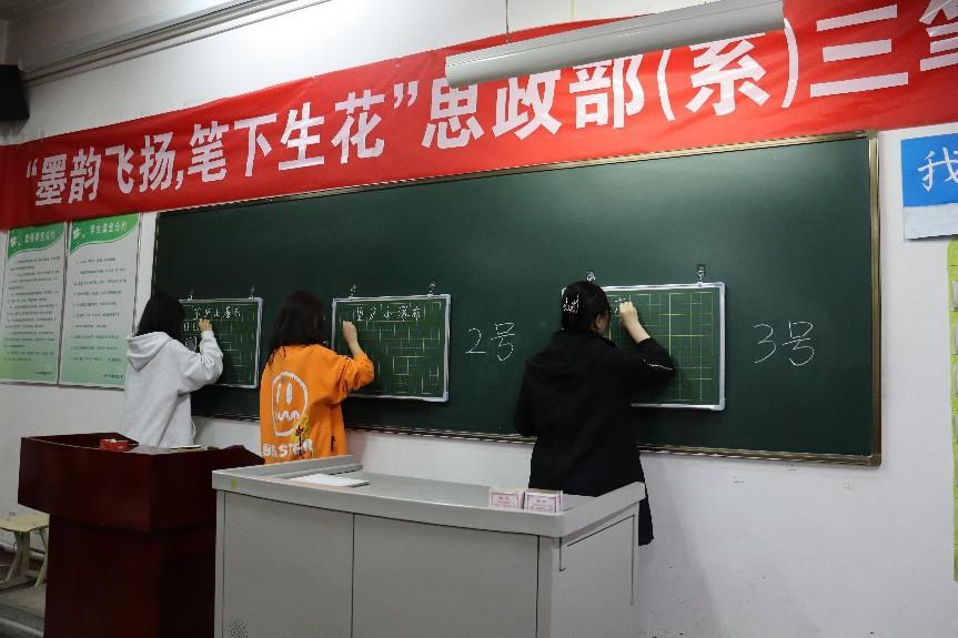 三笔字是教师传授知识信息、传播审美观念、传承民族文化、塑造自身形象的重要载体。为贯彻落实教育部关于强化师范生“三笔字”教学基本功训练要求,提高学生的师范技能和专业素养,丰富大学生课余生活,我系于4月9日晚举办了“墨韵飞扬,笔下生花”三笔字竞赛,思政系党总支书记赵东旭、系主任翟翠玲、系副主任康小兵出席竞赛活动,班主任老师李小旭、张瑞娇、韩弘丽、孙晋媛,思政专业教研室主任王丽,特邀嘉宾中文系书法博士刘亚丽老师担任评委,思政系分团委负责人董贺主持活动,大一大二学生代表130余人参与活动。