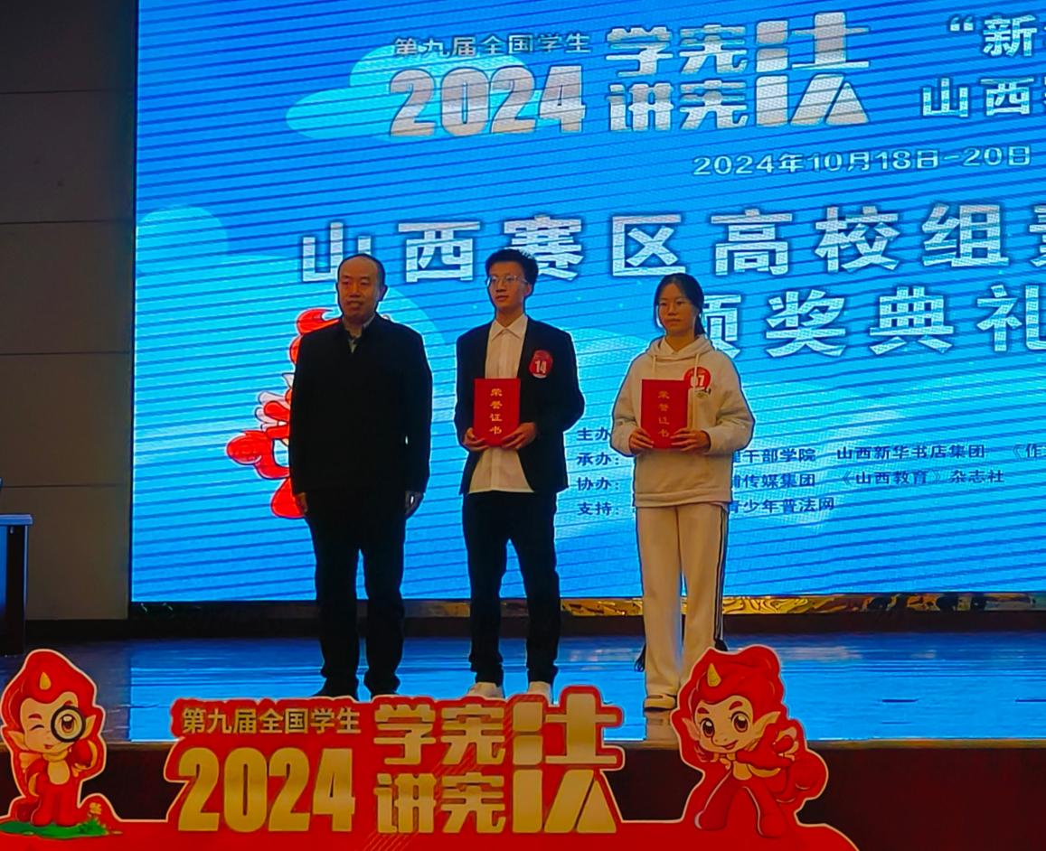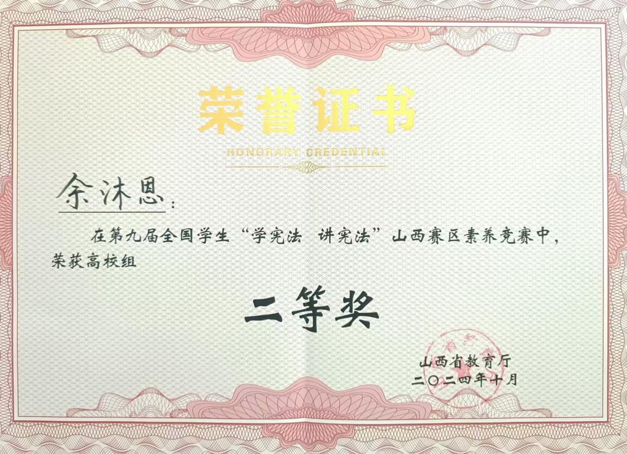 10月19日至20日,第九届全国学生“学宪法 讲宪法”活动山西赛区总决赛在山西经济管理干部学院举行。太阳集团tyc539学生余沐恩代表学校参赛在法治素养竞赛中取得了高校组第二名(二等奖)的好成绩。