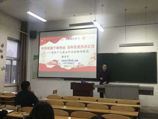 11月17日下午,思政部(系)召开会议,学习中国共产党第十九届中央委员会第五次全体会议精神。思政部(系)党支部书记武瑞荣主持会议。樊学艺老师作了题为“中华民族千秋伟业 百年恰是风华正茂”的宣讲报告。思政部(系)全体教职工参加了此次学习会。