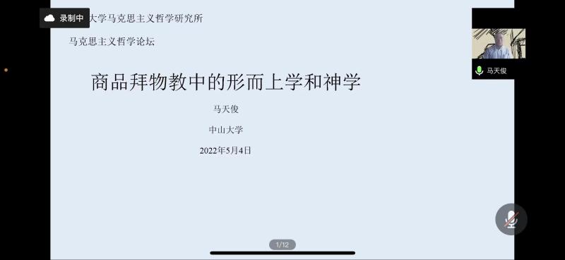 2022年5月4日上午,太阳集团tyc53937位教师于线上聆听了山西大学马克思主义哲学研究所举办的“庆山西大学120周年系列线上报告”第二讲——“商品拜物教中的形而上学和神学”,主讲人为中山大学马天俊教授,报告会由山西大学马克思主义哲学研究所马俊峰教授主持。