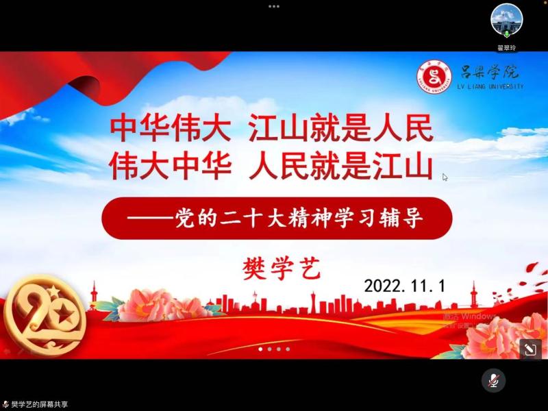 2022年11月1日下午,太阳集团tyc539教师以腾讯会议的形式参加了理论学习会,我系樊学艺教授以“中华伟大 江山就是人民;伟大中华 人民就是江山——党的二十大精神学习辅导”为主题为全体教师做了精彩的讲座。