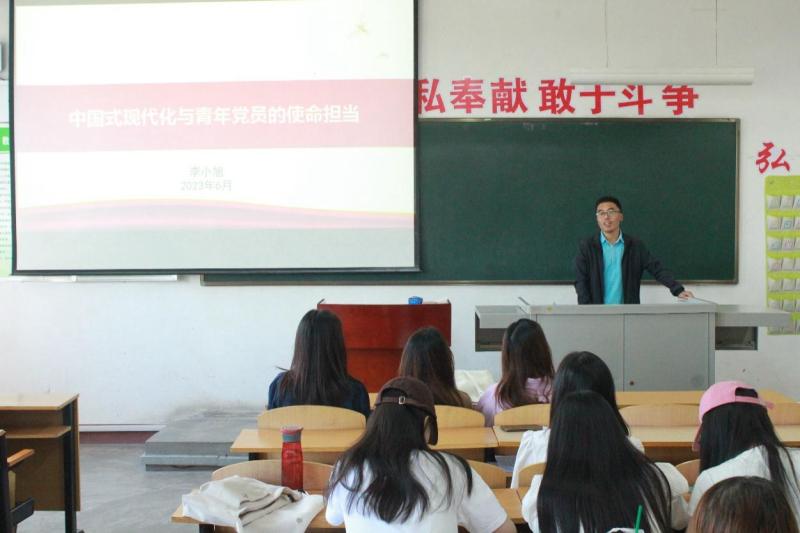 为学习贯彻党的二十大精神,深入开展学习贯彻习近平新时代中国特色社会主义思想主题教育,践行“学思想、强党性、重实践、建新功”总要求,6月2日下午,思政系学生党支部书记李小旭以“中国式现代化与青年党员的使命担当”为主题,为学生党员讲授主题教育专题党课。