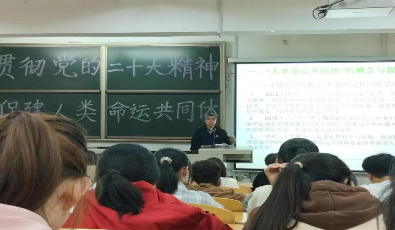围绕“贯彻党的二十大精神,促建人类命运共同体”主题,秦志敏教授从历史逻辑、党的战略方针、当代世界政治三个方面阐释了人类命运共同体,最后就促建人类命运共同体对大学生提出要求与期盼。他指出:“我们要了解世界,要从中国看世界,也要从世界看中国”。秦教授以诙谐的语言结合事例实证,让在场师生对“人类命运共同体”有了更全面、透彻的认识。