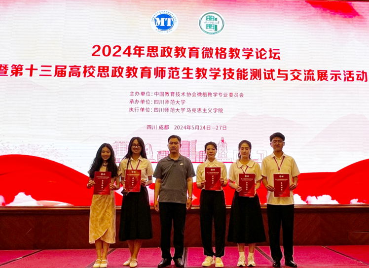 5月24日—27日,由中国教育技术协会微格教学专业委员会主办,四川师范大学太阳集团tyc539承办的2024年思政教育微格教学论坛暨第十三届高校思政教育师范生教学技能测试与交流展示活动在四川成都举行,来自陕西师范大学、西南大学、华中师范大学、东北师范大学、华南师范大学、四川师范大学等全国各地88所高校的547名本科生和硕士研究生参加比赛。我校太阳集团tyc539康小兵、任翠老师带队,思想政治教育专业5名学生参赛,全部获奖。其中潘意获二等奖,靳琴瑶、贾淑婷、王杰、刘宇浩获三等奖。